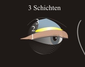 Zwischen der vorderen Hautmuskelschicht (1) und der hinteren Schicht des Lidhebers (3) liegt die mittlere Schicht (2).In diesen Zwischenraum (gelb) kann verschiebliches Gewebe aus der Augenhöhle eindringen.