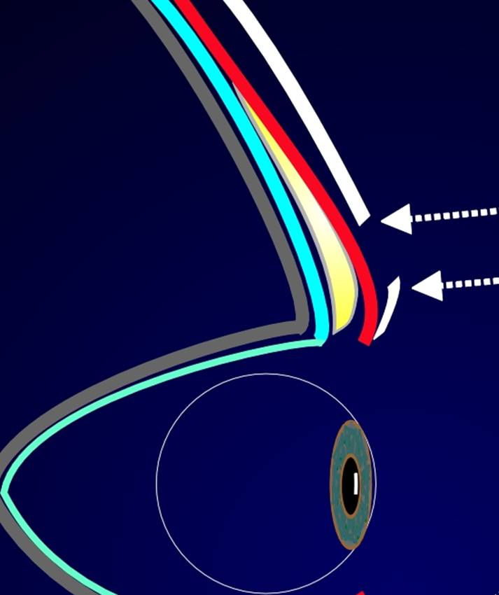 Die Oberlidblepharoplastik kann mit der Brauenhebung kombiniert werden. Durch die Inzision der Blepharoplastik gelangt man auch lateral zum Brauenfettkörper (ROOF) und darunter zum Periost des Jochbeines. Unter dem Periost kann man in einem Tunnel das Schläfenbein erreichen und das Periost der Braue zur Temporallinie hin fixieren. (Fig.6). Dabei wird das Periost zuerst lateral von der Orbitakante abgelöst und danach an höherer Stelle fixiert (Fig.5).