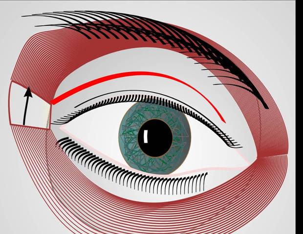 Fig.5: Bei der lateralen Brauenhebung wird der Orbikularismuskel lateral nach oben verschoben, um seine brauensenkende Wirkung zu reduzieren.