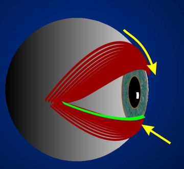Die gelben Pfeile zeigen den Effekt der Muskelkraft des Orbikularismuskels, die am Oberlid vor allem nach unten gerichtet ist.