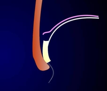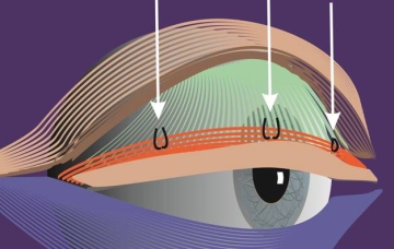 Mit Nähten (schwarz markiert) kann der Orbikularismuskel auf der hinteren Schicht (auf dem tarus und der Aponeurose verankert werden. Dadurch wird eine Hebung des Muskels und eine Aufrichtung der Wimpernreihe erreicht.