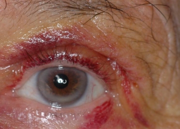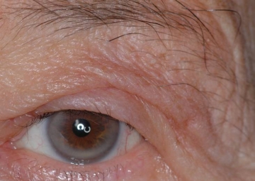 Einfaches Oberlidentropium: der Orbikularismuskel drückt die Wimpern nach unten.