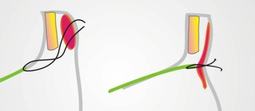 Links: die lockere Sehnenschicht der Retraktoren (grün) hat keine Verbindung zum Muskel (rot), der folglich nach oben abweicht. Von der Rückseite des Lides ausgehend kann man die Sehnenschicht aufsuchen und mit dem Muskel erneut koppeln. Rechts: Der Muskel wird dadurch in einer normalen Position fixiert.