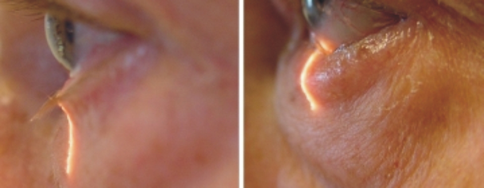 Im Bild links sieht man im Spaltlicht die normale konkave Form des Unterlides mit normaler Posisition des Orbikularismuskel. Im Bild rechts fällt der konvexe Muskelwulst auf, der die Lidkante nach hinten dreht.