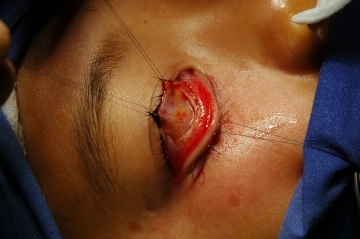 Die Bindehaut wird unterhalb des Tarsus horizontal eröffnet. Die darunterliegende Sehnenschicht der Retraktoren wird freigelegt und mit Nähten am Orbikularismuskel fixiert.