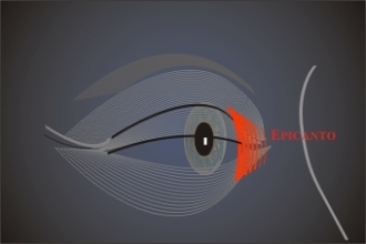 "Biangel" der Lidöffnung: es liegt eine komplizierte, lanzettförmige geometrische Geometrie mit verschiedenen Kurvenformen zugrunde.