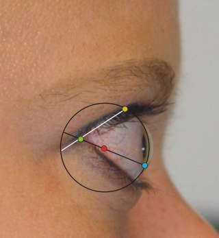 Der Winkel des lateralen Kanthus ist spitzer (30°-50°) als der Winkel des medialen Kanthus (50°-70°).