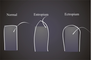 Links: normaler rechtwinkliger Querschnitt der LidkanteMitte: Entropium: spitze Verformung der Lidkante.Rechts: Ektropium: runde Verformung der Lidkante
