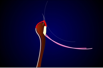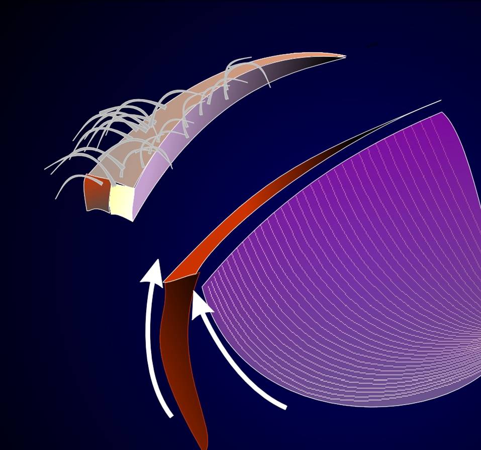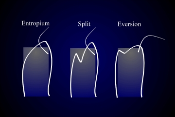 Links: spitzwinklige Lidkante bei EntropiumMitte: Nach Spaltung der Lidkante in ihrer Mitte mit Hochfrequenzchirurgie entsteht eine Furche zwischen den LamellenRechts: Nach Abheilung bildet sich ein annähernd rechtwinkelige korrigierte Form der Lidkante