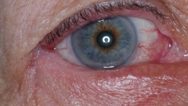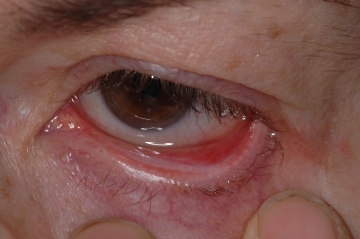 Kompliziertes Entropium durch typische Bindehautnarbe nahe am Lidrand.