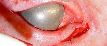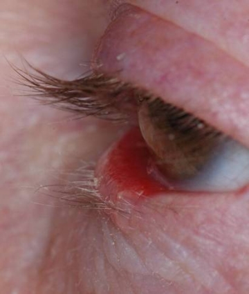 Abb. 12: Die keratinisierte Lidkante ist nach aussen gekippt . Das Richtung des Wimpernwachstums ist nach oben abgewichen.