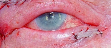 Abb. 16: Postoperativ: die deformierten Bereiche wurden eliminiert. Beide Lidlamellen mussten durch Schleimhaut- und Hauttransplantation rekonstruiert werden.