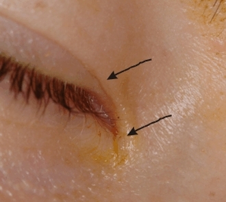 Die subkutane Traktion ist oft eine Begleiterscheinung der kutanen Traktion. Es besteht eine subkutane Gewebsbrücke zwischen dem medialen Oberlid und Unterlid . Diese kann kongenital durch Fusion der Orbikularisfasern zwischen dem Oberlid und Unterlid vor der Kommissur entstehen.