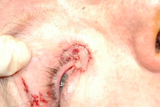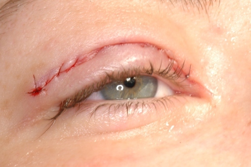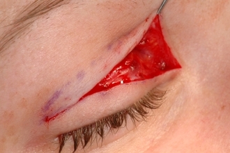 Bei großen Hautdefekten (Defekt nach Durchtrennung einer traumatische Epikanthusfalte) wird ein 30 mm langes lanzettförmiges Hauttranstransplantat aus dem Oberlid entnommen und bogenförmig eingesetzt.