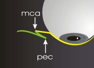 Der Pseudoepikanthus (pec) entsteht durch einen Hautüberschuss mit Faltenbildung (Dermatochalasis) vor dem eigentlichen medialen Kanthus (mca). Überschussfalten bilden sich rechtwinklig (90°) zur Richtung des Überschusses. Überschussfalten lassen sich einfach durch Exzision des Überschusses korrigieren (Verschiebung des Überschusses nach medial und Kürzung) korrigiert werden