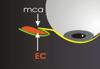 Beim echten Epikanthus liegt überbrückendes Gewebe (EC) innerhalb der Hautfalte und vor der medialen Komissur (mca).