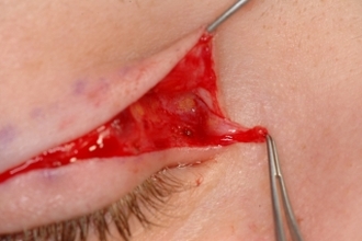 Die supraziliare Inzision kann zwischen der Wimpernreihe und der Lidfurche erfolgen. Die darüber liegende Haut wird lappenförmig vom Orbikularismuskel abgelöst und nach medial verschoben.