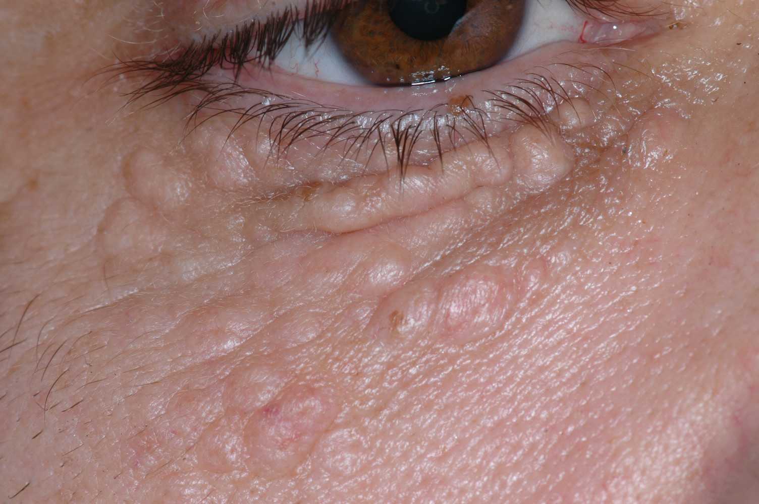 Orbicularis-Muskel trennt, können die Knötchen direkt unter der Hautoberfläche