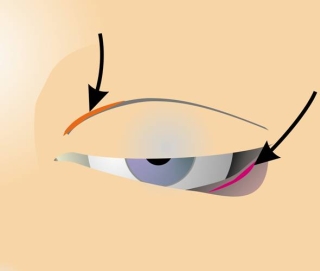 Abb. 3: Die wichtigsten Zugänge in die Orbita:Mediale Orbitotomie: mediale OberlidfurcheLaterale Orbitotomie und Orbitaboden: laterale Binehaut des Unterlides
