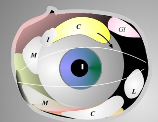 Die elastischen Strukturen der Augenhöhle (Abb. 1), wie die "Sehnenbögen" (die Aponeurose, die Ligamente Whitnall und Lockwood), sowie die radiären Septen gehen von der Tenonschen Kapsel (lig. cingulum) aus. Zwischen den Septen liegt verschiebliches Orbitafett (Abb.2)