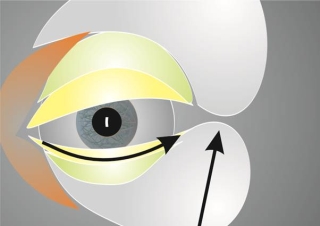 Das Unterlid hat eine viel geringere Motilität als das Oberlid und kann trotzdem über die Interkanthallinie (über den unteren Limbus) aufsteigen. Dies ist möglich dank des präseptalen Orbikularismuskels (lila) , der das Lid über den Limbus nach oben schieben kann (Pfeil nach oben in der Zeichnung rechts).