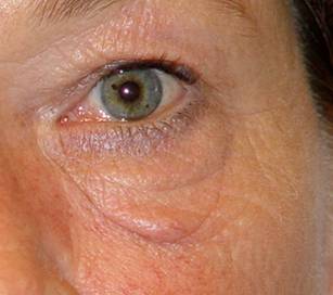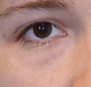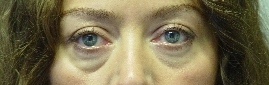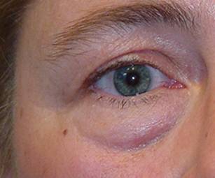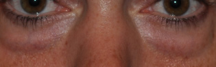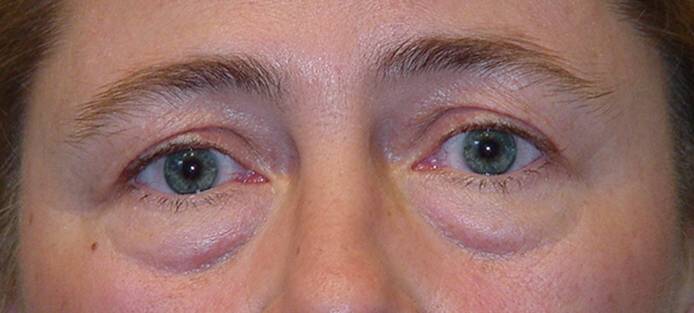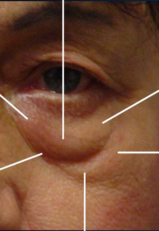 Unterlidfettprolaps mit Furche am unteren Orbitarand.