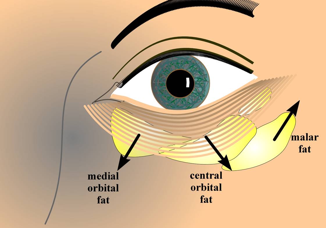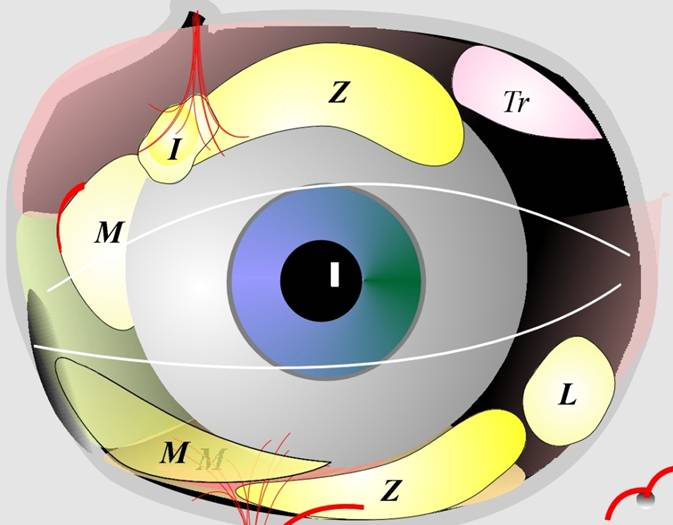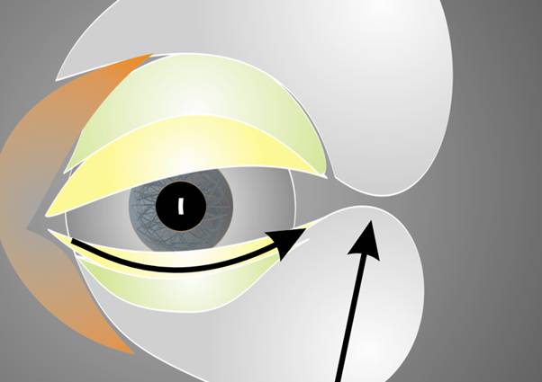 Im Unterlid unterscheidet man 3 Orbitafettkompartimente, die getrennt erreicht werden:M=medial, Z=zentral, L=lateral. Zwischen M und Z liegt der Augenmuskel Obliquus inferior mit dem begleitenden neurovaskulären Leitungsbahnen aus dem foramen infraorbitale. Beides muss geschont werden.