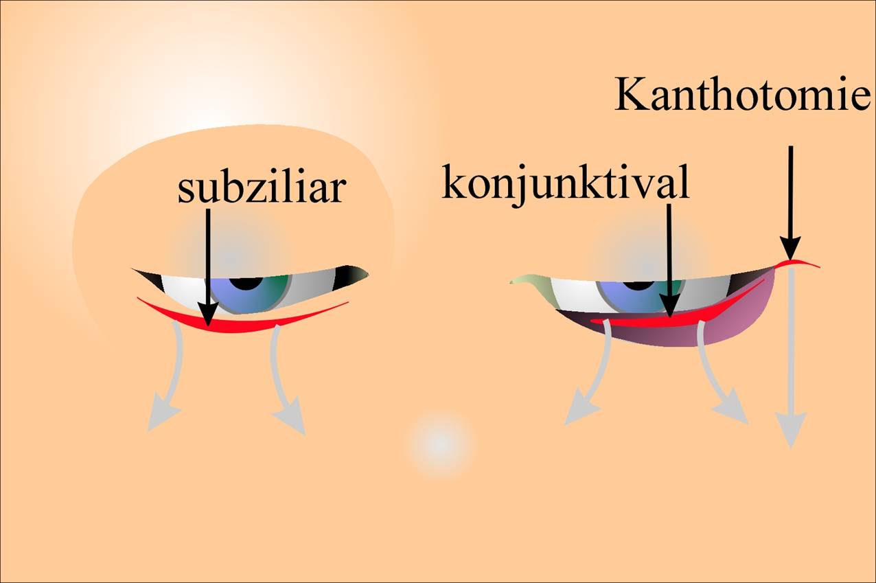 Die laterale Kanthoplastik verschiebt das Unterlid mit der Hautmuskelschicht zum lateralen Kanthus. Der malare Hautmuskellappen wird nach oben verschoben umd am Jochbein fixiert.
