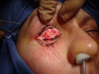 und die tiefe Position des Unterlids verursacht. Die anteriore Lamelle bleibt