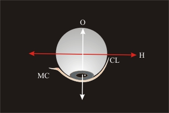 Der mediale Kanthus (MC) liegt vor der horizontalen Achse des Bulbus (H) während der laterale Kanthus (CL) nahe bei dieser Achse liegt. Die Anatomie des medialen Kanthus ist komplizierter als die Anatomie des lateralen Kanthus, da sich das Lid am Tränenpünktchen in einen vorderes und hinteres Lidband teilt und die Tränenkanälchen parallel zum vorderen Schenkel verlaufen.