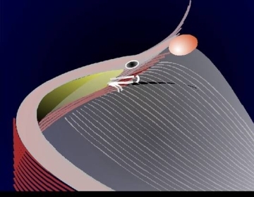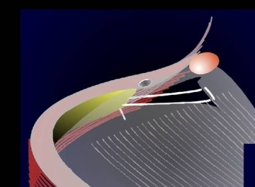 Das hintere Lidband (tangentialer Vektor) liegt tangential dem Bulbus an, um an der crista lacrimalis posterior zu inserieren. Nur durch die Rekonstruktion des hinteren Bandes erreicht man die korrekte Position des Tränenpünktchens am Bulbus. Mit Hilfe der Retraktorenschicht des Unterlides, die direkt mit dem hinteren Ansatz des Bandes zusammenhängen, kann man den tangentialen Vektor nutzen. Über einen transkonjuntivalen Zugang werden medial die Retraktoren freigelegt. um sie am Tarsus neben dem Tränenpünktchen zu fixieren.