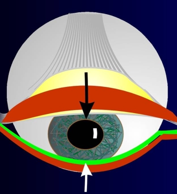 Am Oberlid besteht die Neigung, dass die Muskelkraft des Orbikularismuskels zur Senkung der vorderen Schicht führt (Schwarzer Pfeil).
