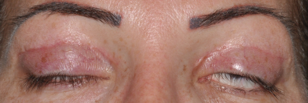 Abb.5: Zustand nach Blepharoplastik ex domo: Die Patientin klagt über fehlenden Lidschluss.