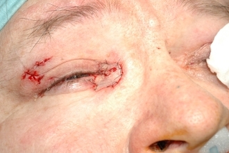 Bei großen Hautdefekten (Defekt nach Durchtrennung einer traumatische Epikanthusfalte) wird ein 30 mm langes lanzettförmiges Hauttranstransplantat aus dem Oberlid entnommen und bogenförmig eingesetzt.