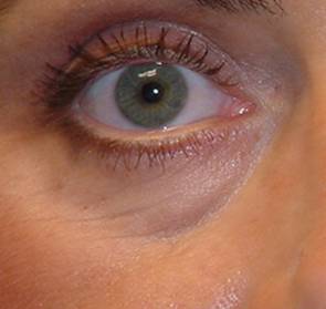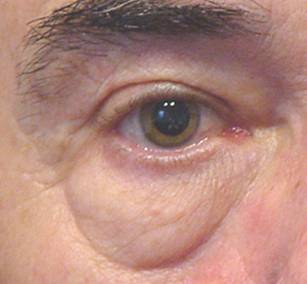 Unterlidfettprolaps mit Furche am unteren Orbitarand.