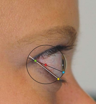 des Bulbus). Die Linie zwischen grünem Punkt (Lidwinkel) und gelbem Punkt